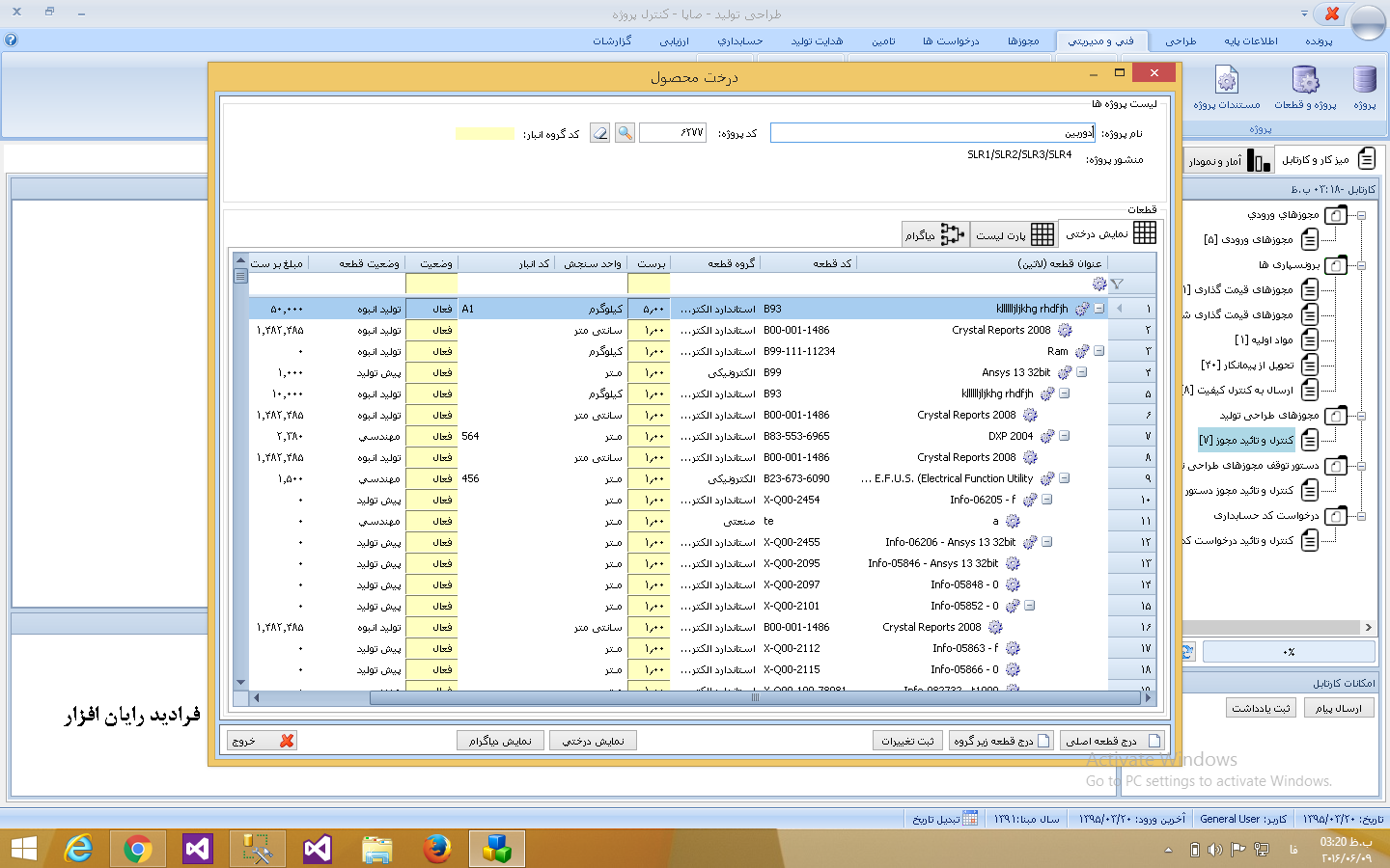 o پروژه و قطعات: ساختار درختی محصول، پارت لیست محصول، درخواست آزاد سازی، برست،کد انبار،